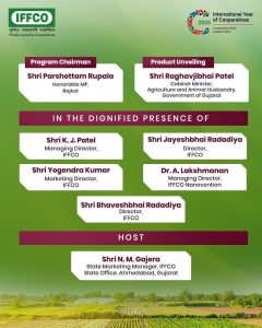 The launch event was held in Gandhinagar and was graced by Sh. Raghavji Bhai Patel, Hon’ble Agriculture Minister, Government of Gujarat, as the Chief Guest. The event also saw the presence of several dignitaries including Sh. Purushottam Rupala, MP, Rajkot; Sh. Dileep Sanghani, Chairman, IFFCO; Sh. K J Patel, Managing Director, IFFCO; Dr. A Laxmanan, MD, IFFCO-Nanoventions; Sh. Bhavesh Radadiya, Director, IFFCO; Sh. Sandeep Ghosh, Unit Head, IFFCO Kalol; Sh. Yogendra Kumar, Marketing Director, IFFCO; the State Marketing Manager, and many cooperators and farmers from across the state.